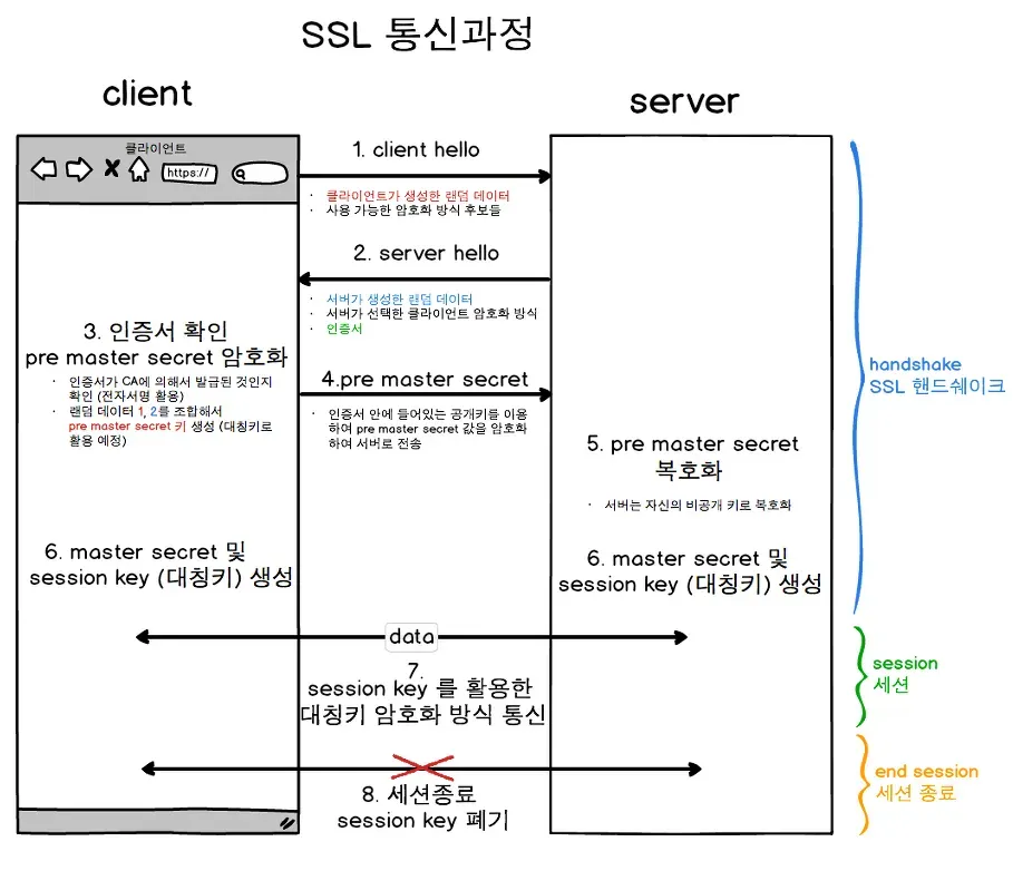 - SSL 통신 과정은 “SSL 핸드셰이크 → Session → Session 종료” 순으로 진행된다.