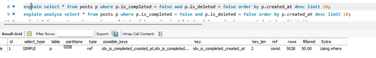 내가 걸어놓은 Posts 테이블의 인덱스는 idx_is_completed_created_at과 idx_is_completed_id_created_at 두 개이다.